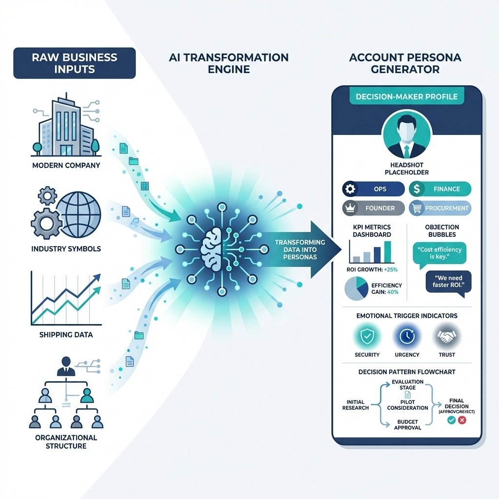 Turn a real B2B prospect account into a believable decision-maker persona (Ops, Finance, Founder, Procurement) with KPIs, day-to-day pressures, hidden objections, emotional triggers, realistic "no" phrases, winning strategies, red flags, likely questions, and roleplay calibration—designed to feed roleplay, objection prep, and outreach crafting without inventing hard facts.
