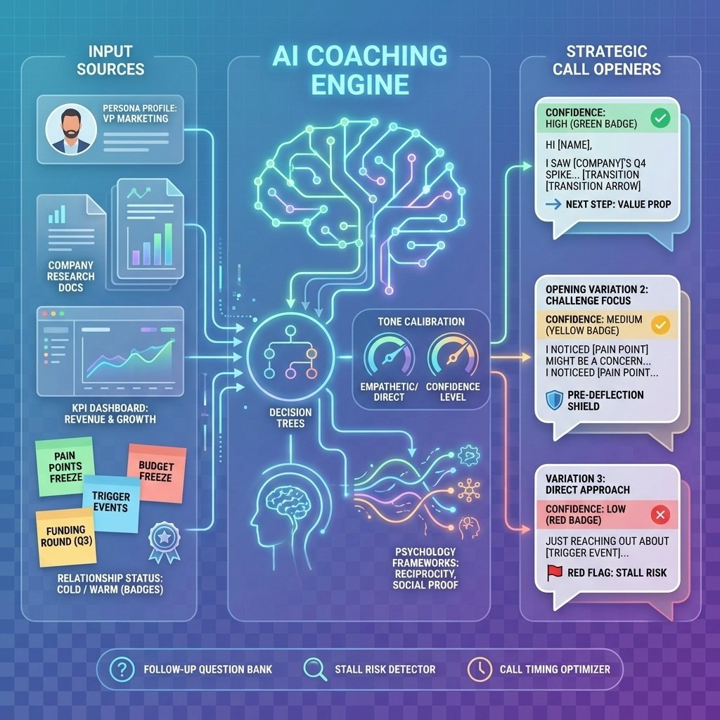 Generate 3 situational opening lines (under 20 seconds each) for cold/warm shipping sales calls—tailored to persona pain points, KPIs, tone, and trigger events—with confidence ratings, next-line transitions, objection pre-deflection, follow-up question bank, and stall-risk red flags, without sounding scripted or fabricating facts.